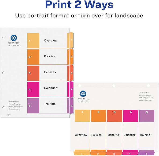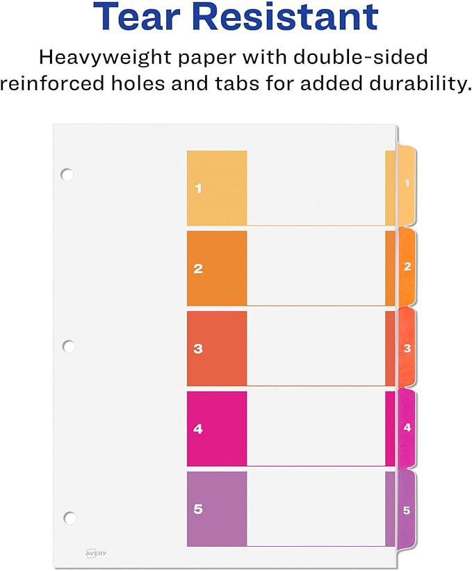 Avery 5 Tab Dividers for 3 Ring Binders, Customizable Table of Contents, Multicolor Tabs, 6 Sets (11187)