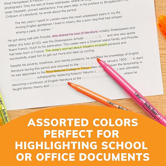 - Highlighter set with translucent ink that emphasizes what's important on the page without obscuring the highlighted text