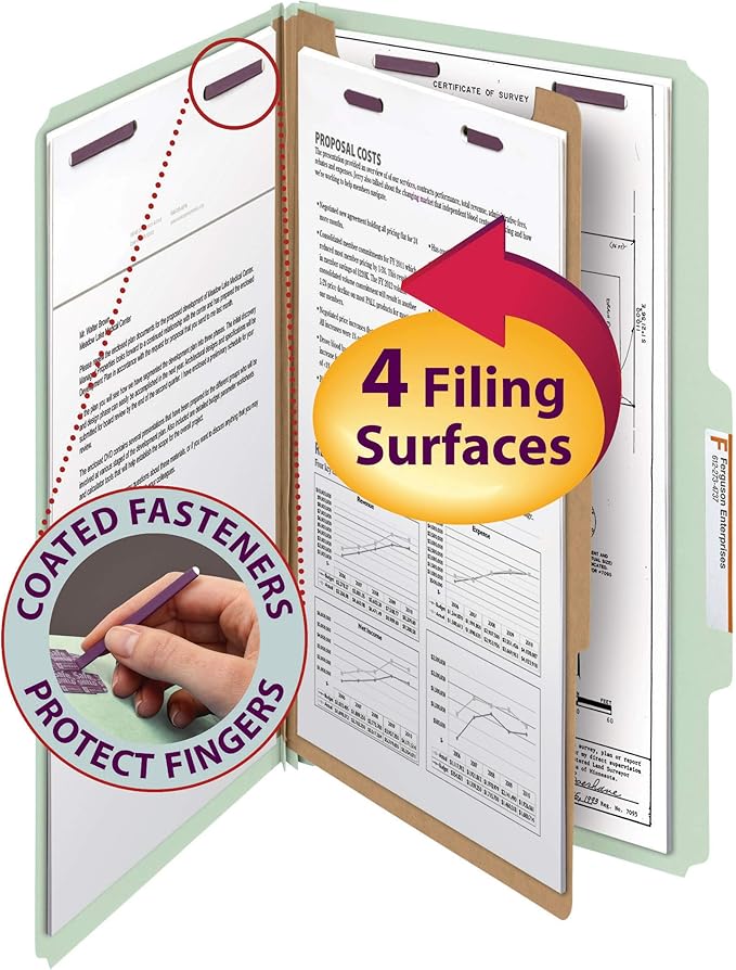 - Includes 10 legal size (14-3/4" W x 10" H) partition folders with patented SafeSHIELD coated fasteners that prevent finger cuts, eliminate paper tears and reduce excessive fastener crinkling