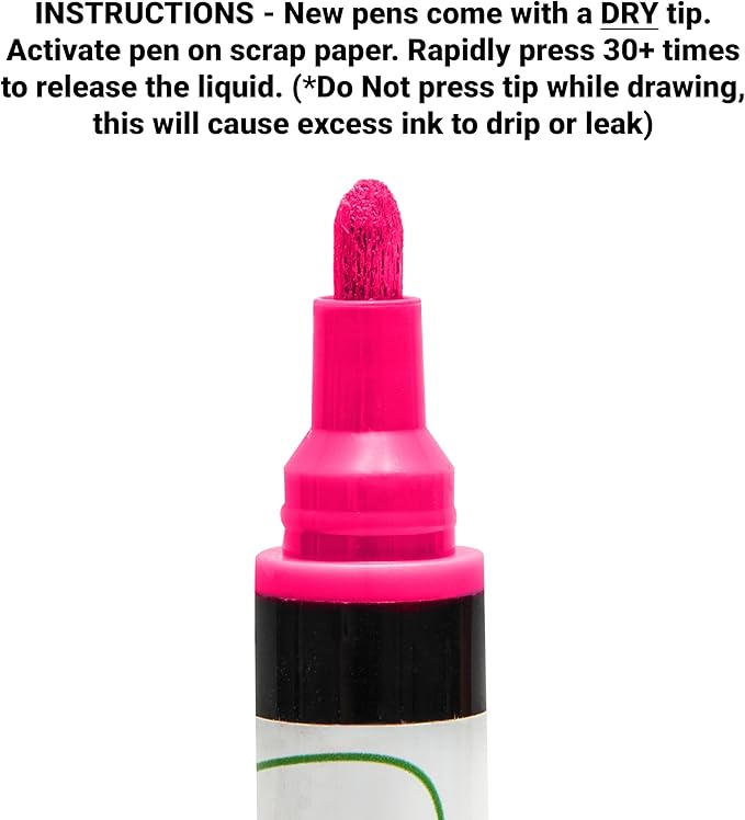 - INSTRUCTIONS TO START- Activate new pen on a scrap piece of paper. Gently press 20-30 times to release the liquid inside. (Do Not pump tip while writing, this will cause excess ink to drip or leak.)