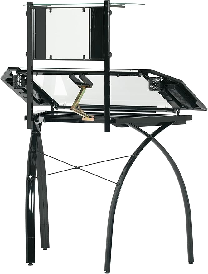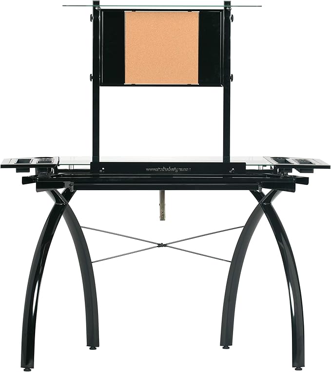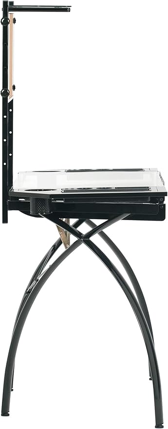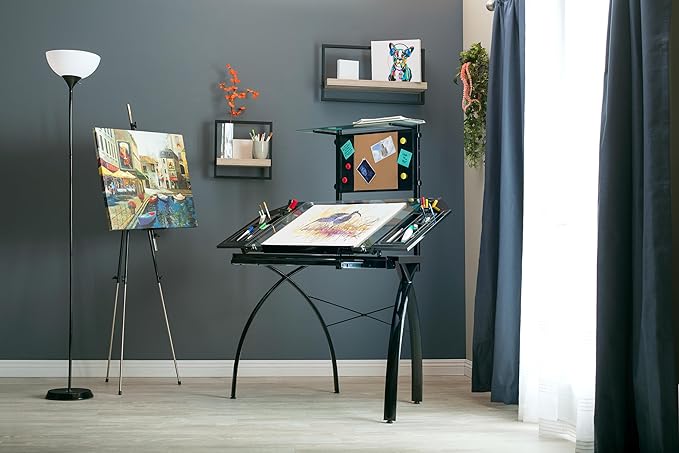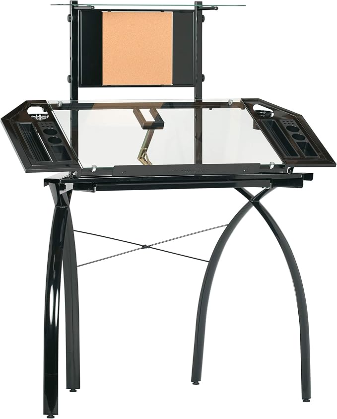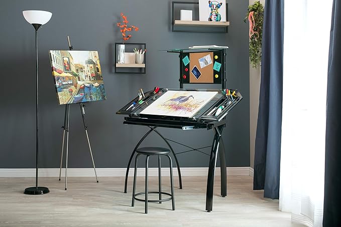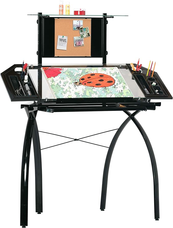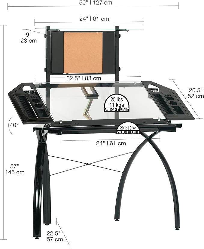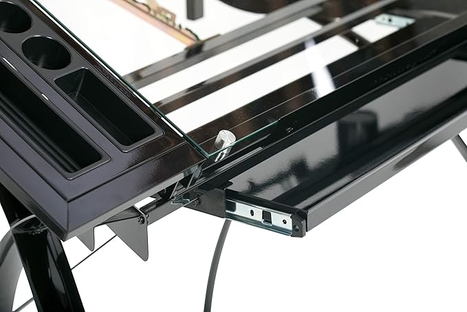 - Main Work Surface: 32. 5"W x 20. 5"D with Tempered Glass for Safety and (4) Removable Art Trays for Pens, Pencils, Brushes & Supplies