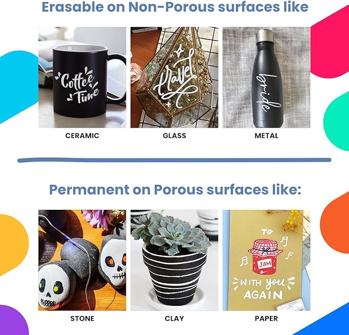 - Comes Off Easy - The white marker chalkboard pen will work on almost any surface! These chalk board markers will erase off non-porous surfaces such as glass & mirrors (dry & wet erase) & permanent on porous surfaces (like wood).