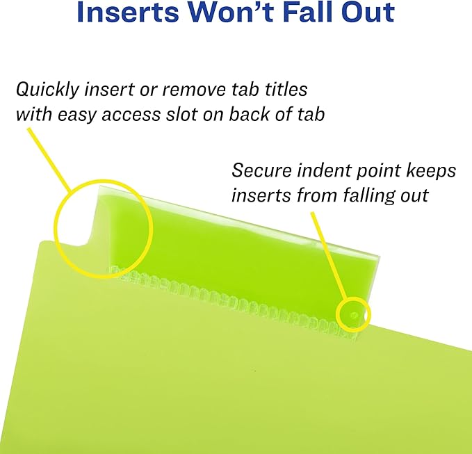 - Secure Inserts: Each tab on these page dividers incorporates a secure indent lock system and easy access slot to keep inserts firmly in place and simple to adjust