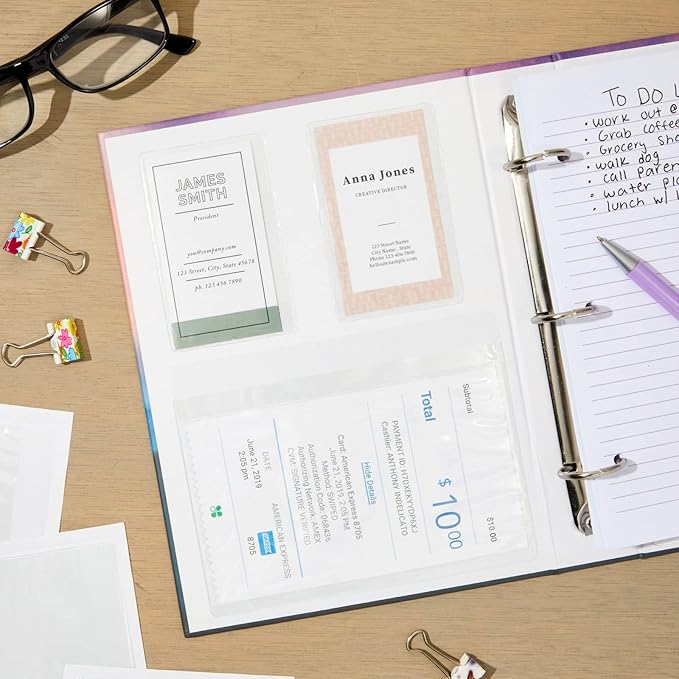 - Plastic Adhesive Pockets: Use these self-adhesive pockets to neatly organize your various-sized business cards, invoices, or photos in a planner, presentation book, or picture binder