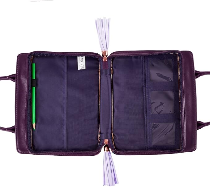 - Scripture Bible Case: This stylish purple case features the sentiment “Blessed” in rose-gold letter studs. A watercolor design is on the front and back slip pockets and tassels on the zipper pulls.