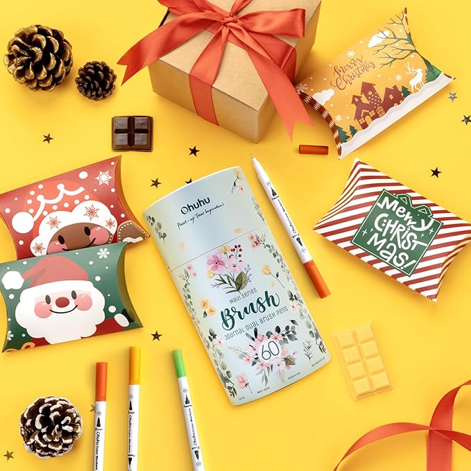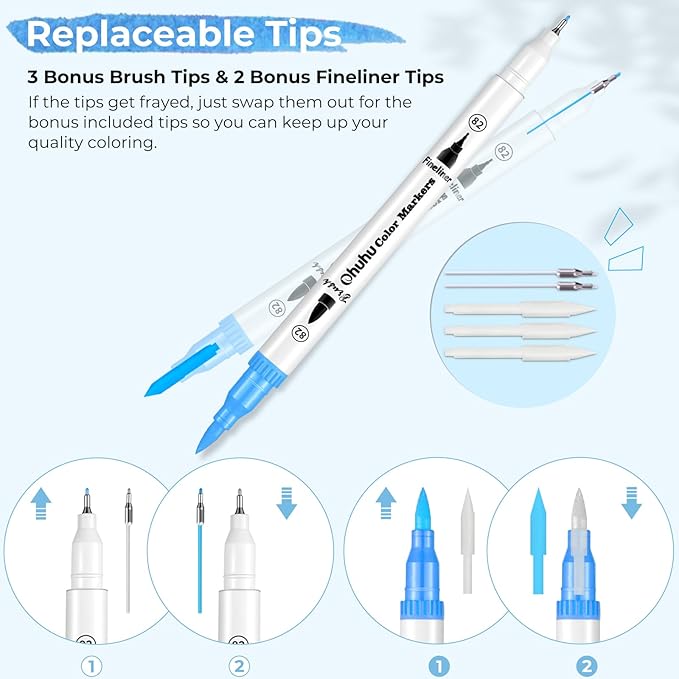 - INCLUDES 5 REPLACEMENT TIPS: Each package comes with 3 replacement brush nibs, 2 fine tips, and a pre-printed numbered color swatch card for your convenience. Ohuhu colored markers set make a perfect gift for birthdays, Christmas, Valentine’s Day, back to school, or any occasion!