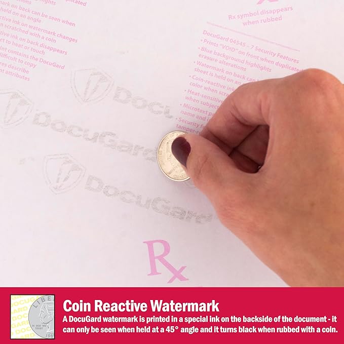 - Security paper features include: a printed artificial watermark; microtext printing which is only legible when magnified, but illegible when copied; hidden message technology (a “VOID” appears when copied); a blue colored background that shows alterations when erased; coin reactive ink that turns black when rubbed with a coin; and a RX symbol and security features listing that are both printed with heat-sensitive ink and disappear when copied.