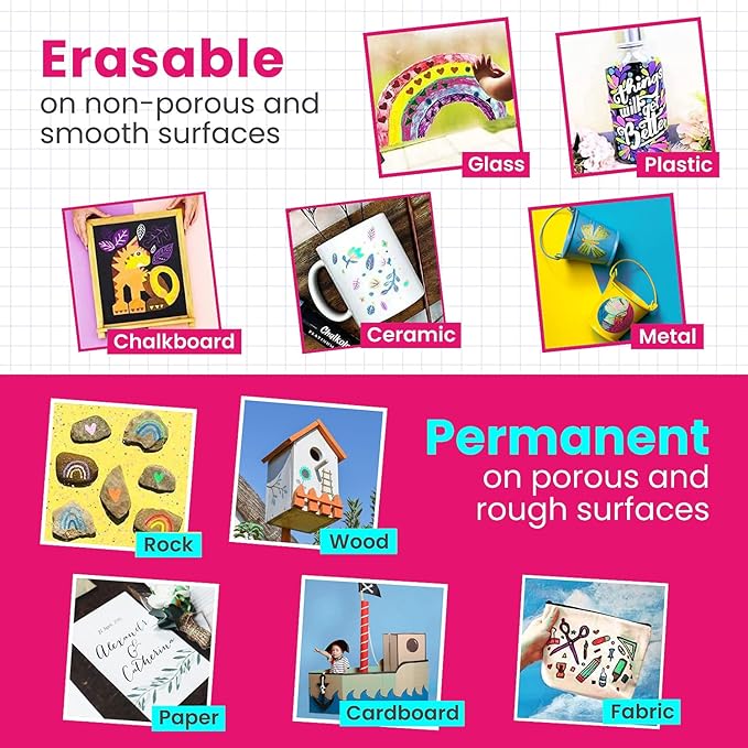 - Comes off Easy - The chalkboard pen will work on almost any surface! Will erase off non-porous surfaces; such as blackboard (wet erase), glass & mirrors (dry erase) & the ink is Permanent on porous surfaces