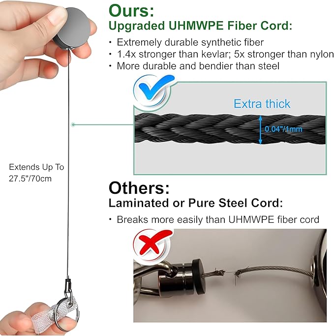 - Unbreakable Cord. Forget annoying cord breaks, the 27.5" UHMWPE fiber cord makes our retractable badge reel more flexible and stronger than steel wire. Unlocking doors has never been this easy.