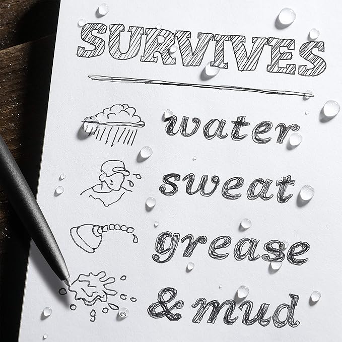 - WEATHERPROOF PAPER: 64 pages / 32 sheets per side spiral notepad. All-weather paper won’t turn to mush when wet and will repel water, sweat, grease, mud, and even survive the accidental laundry mishap. Make sure your pocket notebook stays RIGHT in the Rain.
