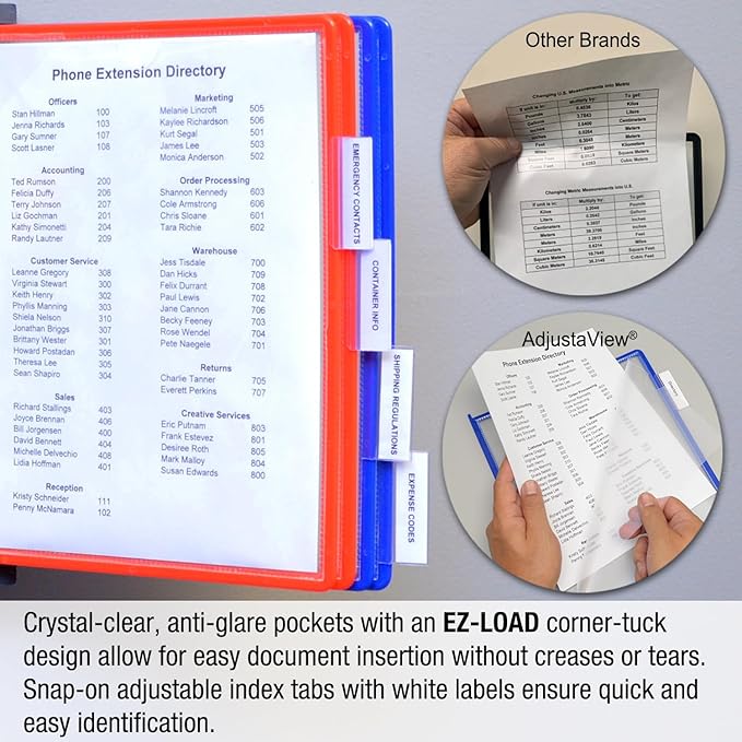 - EASY LOAD POCKETS & TABS - Crystal-clear protective, easy-load, corner-tuck pockets make inserting documents easy and free of creasing or tearing. Each pocket displays two single-sided sheets of 8 1/2" x 11" letter sized paper or one double-sided document. Adjustable index tabs and labels quickly direct you to the appropriate page.