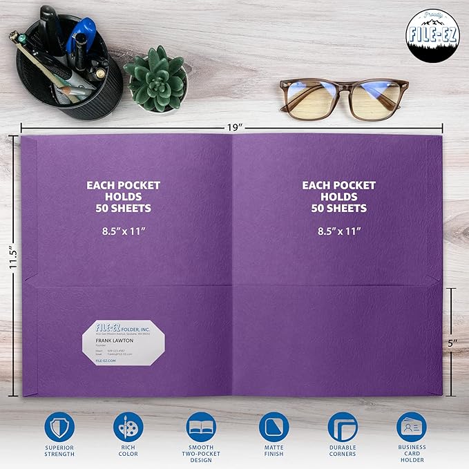 - PACKAGE INCLUDES: Your selected PACK SIZE and COLOR of Two-Pocket Folders constructed using Textured Paper, Matte Finish, Supports Letter Sheet Size (8 1/2" x 11")