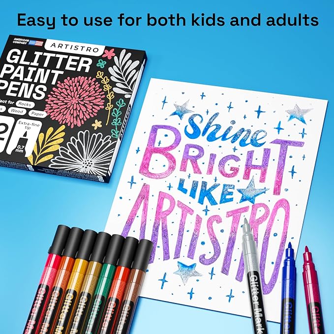 ARTISTRO 12 Glitter Paint Pens Sparkly and Shiny for Rock Painting, Stone, Ceramic, Glass, Wood, Fabric, Scrapbooking, DIY Craft Making, Coloring, Acrylic Glitter Markers Extra-Fine Tip 0.7mm