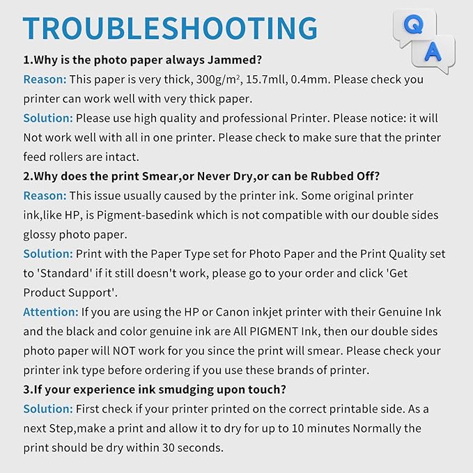 - Purchase Notice!!! Please read carefully before purchasing. Our Paper Thickness is 80lb and the Ink Used is Dye Ink Only. So please make sure whether your printer can print our paper first, you can check the two parameters on your printer's manual about paper thickness and ink, there are differences in the parameter names of different brands:Paper Thickness Parameter Name:Document&Media Capacity /Support media weight /Paper Weight Ink Type Parameter Name:Compatible ink types/Ink Palette Supported (Colors) If you can't find the relevant parameters, and you're not sure if this paper is suitable for your printer. Please contact us by clicking on "Seller Support".