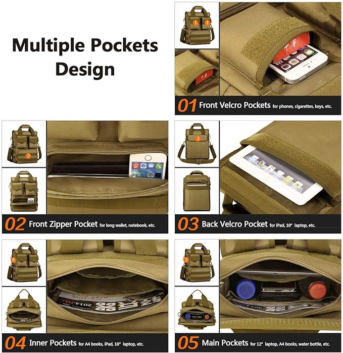 - ✔ STRUCTURE -- 1 x main compartment for streamlining tactical, office essentials and laptop, 3 x front pouches for staying organized and conveniently locate all of your important tools, 1 x Back compartments can hold a number of documents, such as passports, credit cards, etc.