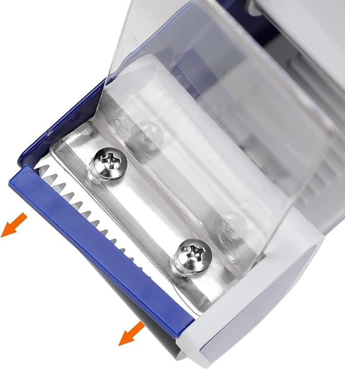 • Metal flap for conveniently threading a new tape roll; blade cover for added safety when not in use