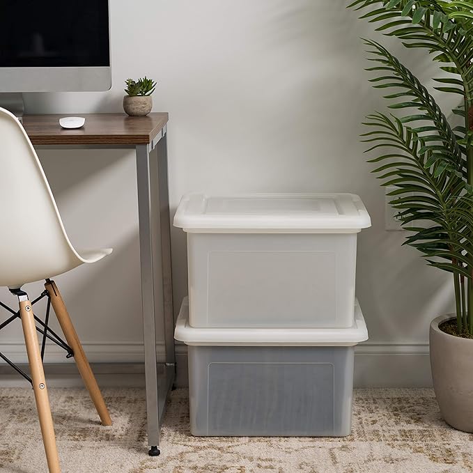 IRIS USA File Box File Organizer Plastic File Box for Letter/Legal File, BPA-Free Plastic Storage Bin Tote Organizer with Durable and Secure Latching Lid, Stackable, Nestable, Pearl 35 Qt. 4 Pack