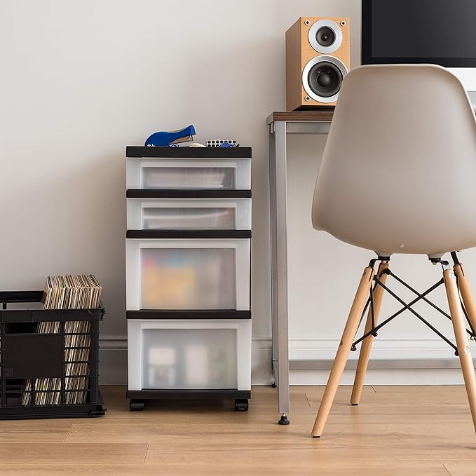 IRIS USA Plastic Drawer Storage Organizer Rolling Cart, with Wheels Casters, 4-Drawers, for Classroom Art Craft Supplies Dresser Closet Bathroom Bedroom, Top Organizer for Small Parts, Black/Pearl