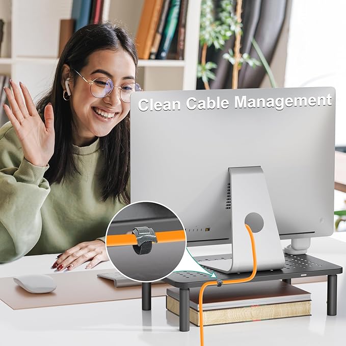 - Ergonomic: The height-adjustable monitor riser can raise a computer monitor, notebook, or any device by 3.9 inches, 4.7 inches, or 5.5 inches off the desk to create a comfortable viewing position and a healthier sitting position which helps reduce stress on the neck and back.