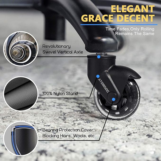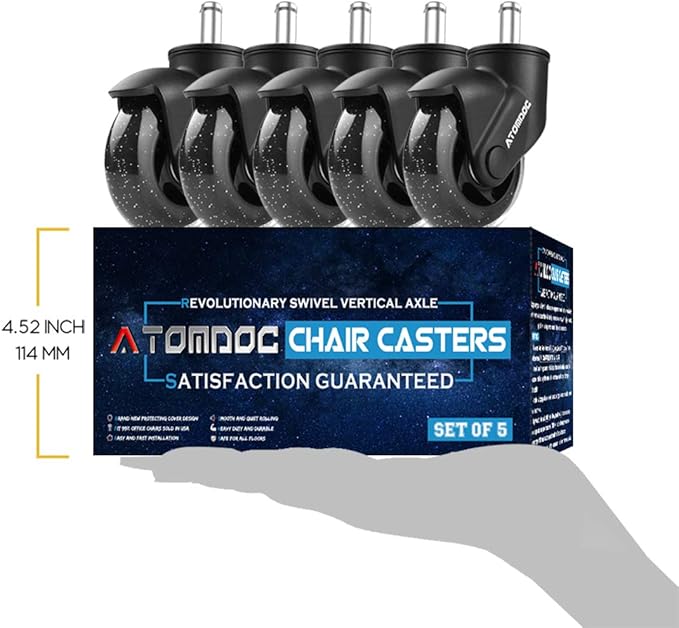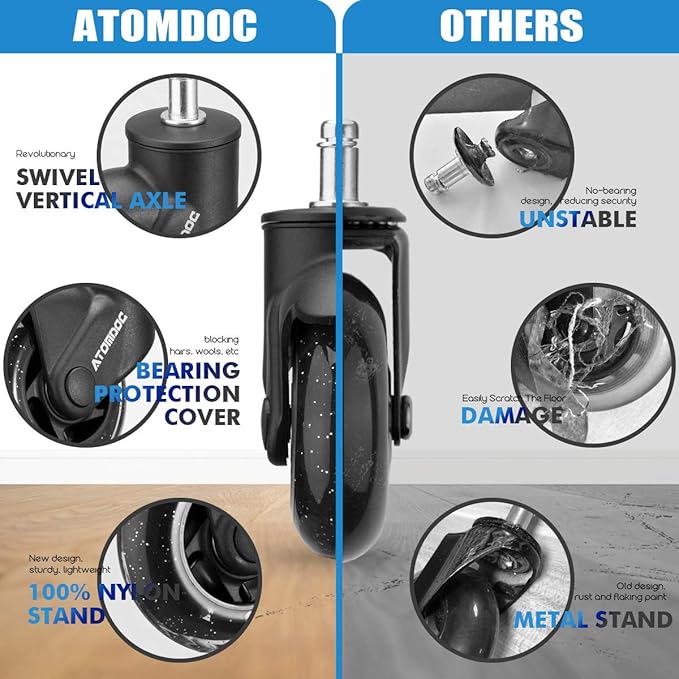 - Incredibly Smooth & Quiet –[Newly revolutionary design by ATOMDOC] With the new type 0.35 inches double ball bearings and dustproof top cover, ATOMDOC caster wheels provides you amazing motility and stationary and mostly minimizes the noise.
