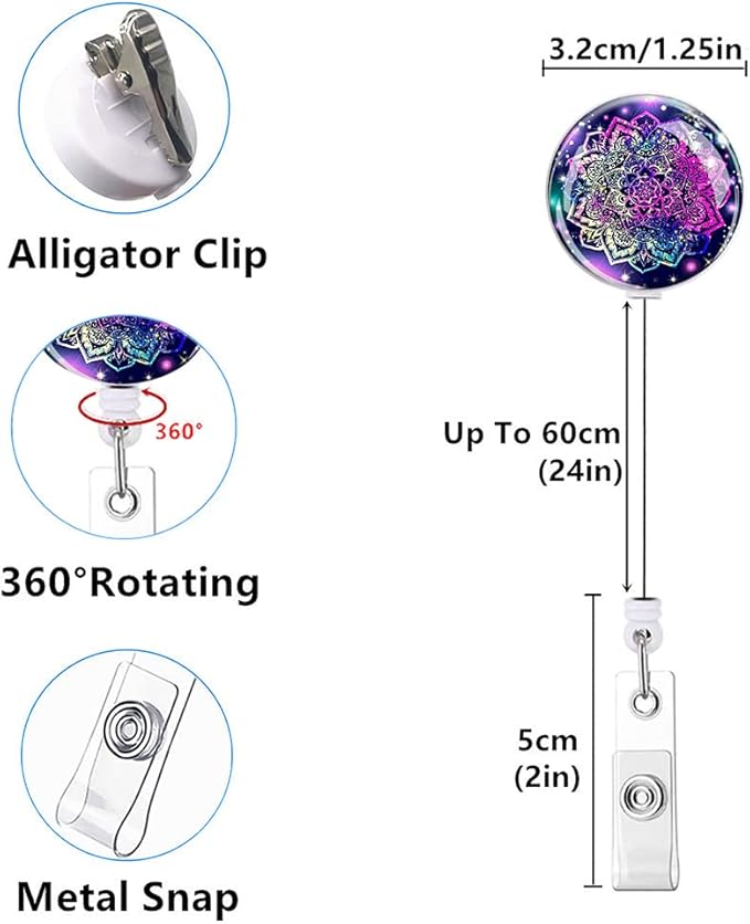 - 【Badge holder Specification】 badge reels Diameter 1.25inch(3cm),retract extension 24in(60cm) nylon rope.Sturdy alligator clip never drop off your ID badge