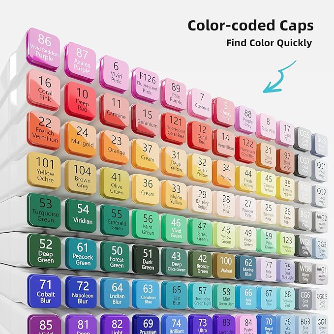 - COLOR-CODED CAPS - Organize your colors easily with our color-coded caps. They also help to keep the tips from drying out, ensuring long-lasting use. Plus, our portable carrying case with a zipper provides easy travel and storage for reuse