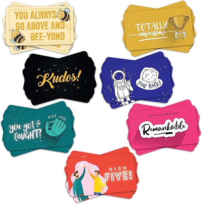 - PREMIUM QUALITY: Our kudos cards are crafted from high-quality cardstock to ensure a premium feel and long-lasting durability. Each card is sturdily built to withstand frequent use. Designed in a compact 2"x3.5" format, these flashcards feature smooth, rounded corners, allowing kids and adults alike to handle them with ease. Use these cards as lunch notes for kids or as thank you cards in businesses.