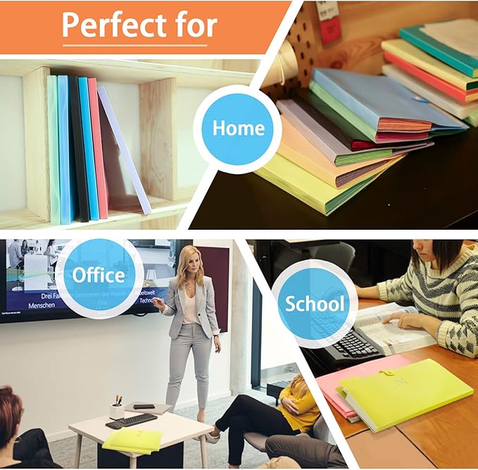 - [Product Dimensions] The file pocket measures 12.8 x 9.5 x 0.7 inches. It is sturdy, portable, lightweight, and colorful. It can fix a maximum of 150–200 pages and fits A4 and letter sizes.