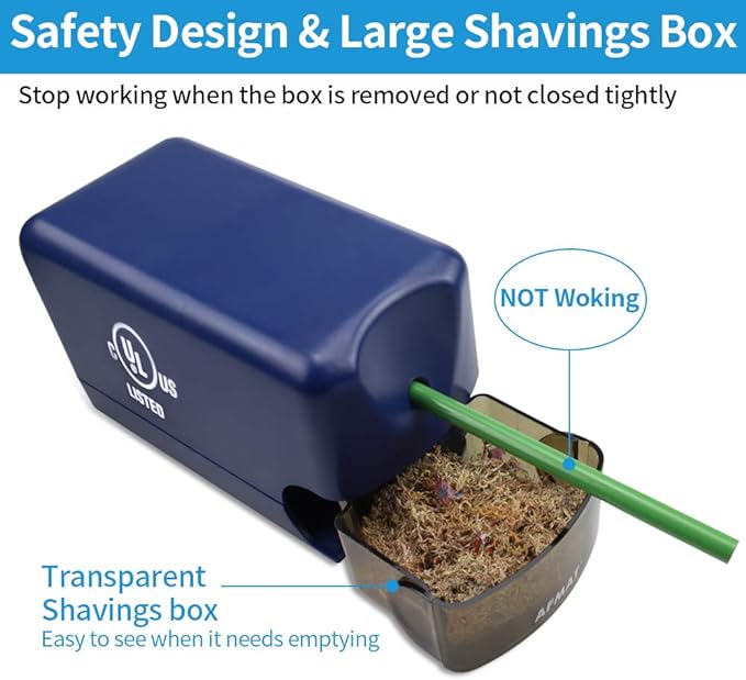 - UL Listed Electric Pencil Sharpener: Our classroom pencil sharpener is UL listed and has no issues after sharpening 100 pencils at a time. It is faster, more durable and powerful than any other helical blade sharpeners due to its bigger and stronger helical blade and motor. This pencil sharpener is ideal for kids, teachers, students, engineers, children, artists, and anyone who needs a heavy duty pencil sharpener!