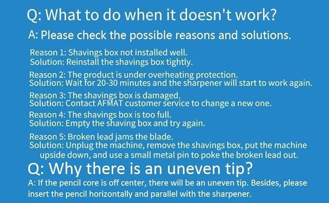 - If the pencil sharpener doesn't work, please check the possible reasons and solutions.▎Reason 1: Shavings box not installed well. Solution: Reinstall the shavings box tightly.▎Reason 2: The product is under overheating protection.Solution: Wait for 20-30 minutes and the sharpener will start to work again.▎Reason 3: The shavings box is too full.Solution: Empty the shaving box and try again. ▎Reason 4: Broken lead jams the blade.Solution: Use a small metal pin to poke the broken lead out.
