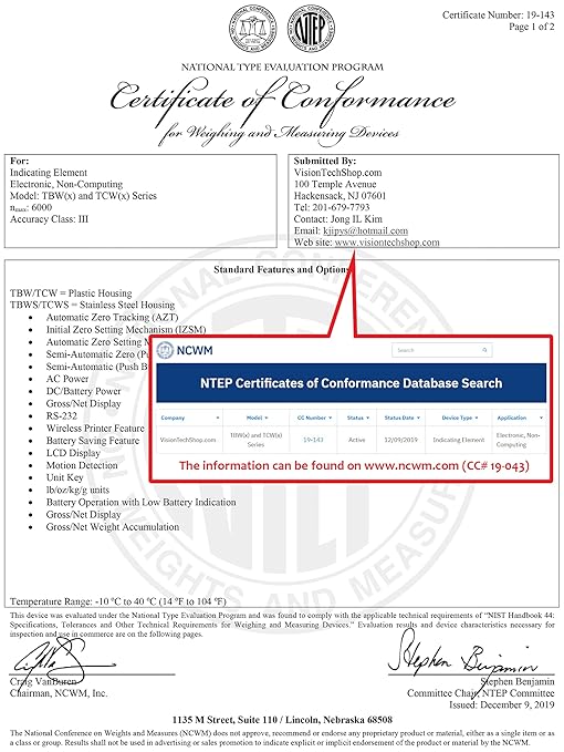 - Lb/Kg Switchable, Easy Operating, Adapter included, Battery Operated, NTEP Certificate, Indicator CC# : 19-143, Platform, CC# : 19-144