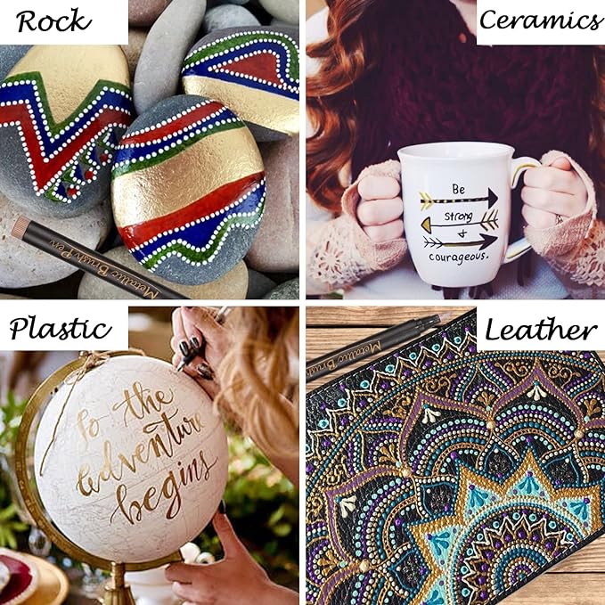 • Marks on Most Surfaces - Acid-free metallic markers for black paper, and work on most surfaces, such as ceramic, fabric, cardstock, rock, wood, and more. Unlike most metallic paint pens, you do not need to shake them when using our bright metallic markers