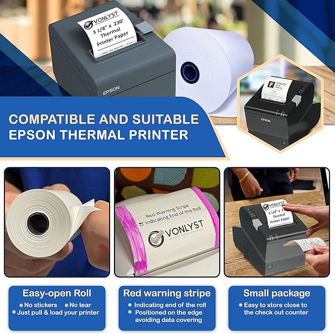 - EASY-OPEN ROLL no stickers, no cut requiring, just pull the paper roll and load your Epson Thermal Printer. Vonlyst thermal paper rolls come with a red stripe mark positioned at the edge of receipt paper to avoid covering data, this red mark indicates the end of receipt paper roll and paper has a free end release eliminating paper jam. Vonlyst thermal paper roll for Epson Printer is built to use from the beginning till the end with guaranteed 230 feet long of paper per roll