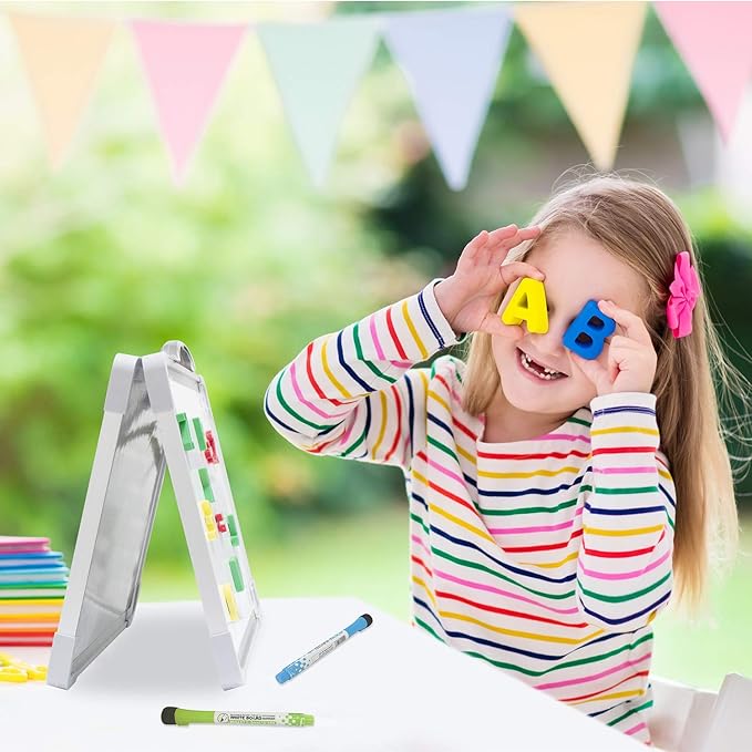 - 【Portable & Multi-Use】2.4lbs double-sided magnet dry erase board easel with solidly built but light weight which can stand on any desktop, It is portable with a handle on the top for travelling, so It is a good choice for home, school, office, small group instruction, kitchen, stores, dormitory and classroom etc. Perfect for play counting, guided reading, learning, presentation, drawing, education and grocery list etc, without paper wasting.