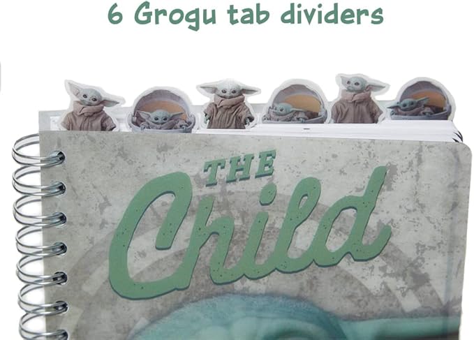 • 8x7 JOURNAL - A spiral bound notebook for kids. Divider pages feature characters, sayings and themes from the Disney+ Mandalorian TV Series.