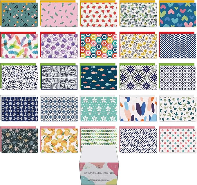 - 100 Unique Blank Cards With Envelopes: Never send the same cards to multiple individuals. That’s because each of our blank note cards is expertly crafted with fresh signature design - no duplicates.