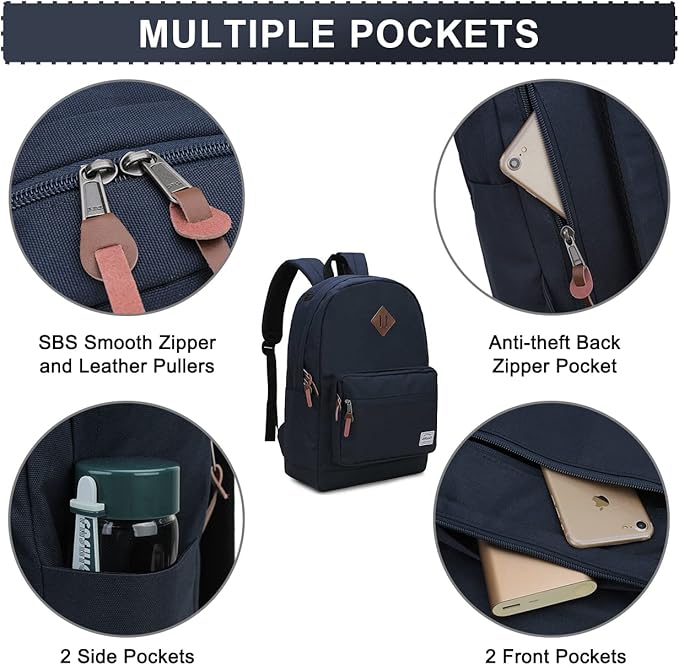 - EASY TO ORGANIZE: Classic backpack features 10 pockets that fits all of the stuffs you need.External access to 2 front zipper pockets,2 side pockets for water bottle ,1 anti theft back zipper pocket for wallet,Internal access to 1 main zipper compartment includes 1 padded laptop compartment fits 15.6 inch laptop ,2 slip pockets and 3 zipper pockets keep all your things organized and easy to access.