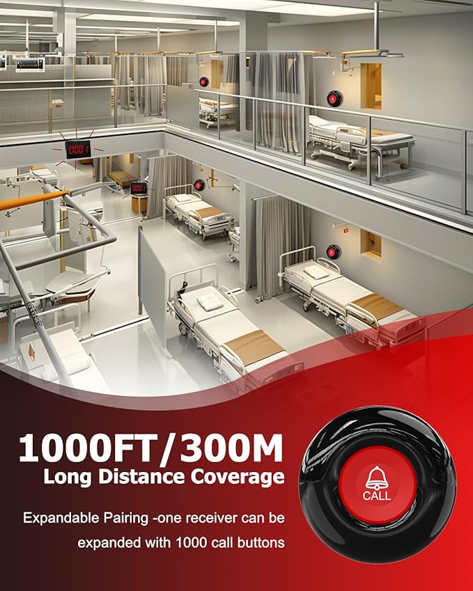 - EXPANDABLE TO 1000 CALL BUTTONS: The nurse call system is ideal for both small and large environments, making it perfect for nursing homes, hospitals, restaurants, and businesses.