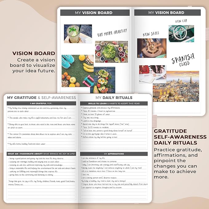 - SET & ACHIEVE LIFE GOALS STRATEGICALLY – This goal setting planner 2025 will help you create a vision for your life, define your life goals, and incorporate them into your monthly, weekly, and daily agendas.
