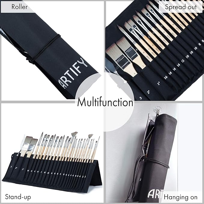 - Nylon Cloth Roll: Start painting with ease by simply unrolling your brushes! Our portable, stylish, and lightweight roll fits comfortably in a carry bag or backpack. Importantly, it provides essential protection for your tools against damage. The high-density nylon is comfortable and gentle in your hands, while also being waterproof and oil-proof for the brushes it holds