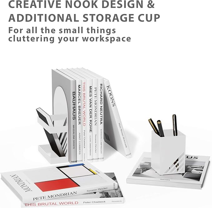 - BONUS PEN/PENCIL HOLDER: As a gift from us to you, our snow white metal bookends come with a bonus accessory you'll find useful. Use the matching white container as a pen cup, pencil holder, succulent planter or desktop catchall.