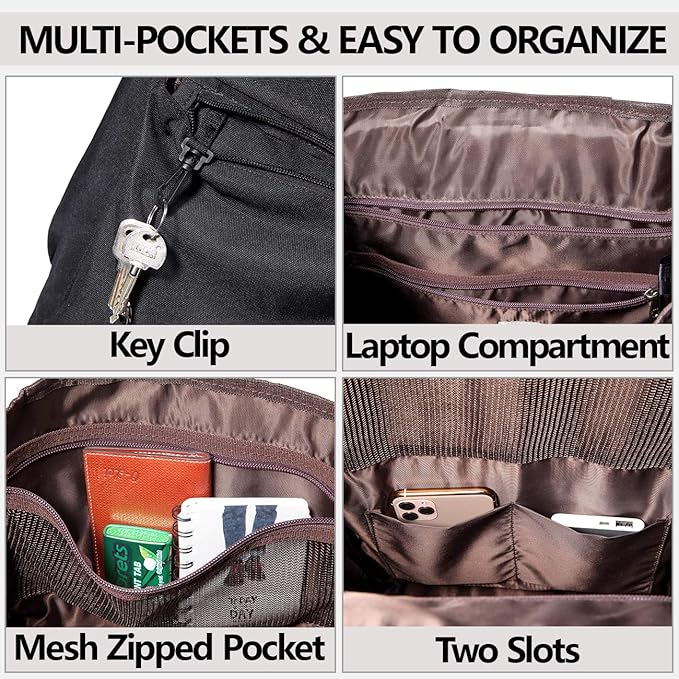 - MULTI COMPARTMENTS: The padded laptop compartment keeps your laptop safe, the main compartment fits you binders, A4 files, textbooks. There are 2 slip pocket, 1 mesh zipper pockets and 2 zipped pockets for your personal belongings. One outer zipper front pocket is with a key clip and 1 mesh pocket. There is also a secured pocket on the back for your wallet, phone etc.. Two side external pockets is designed for your bottle and umbrella.