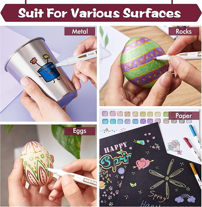 - 【Works on most surfaces 】: Metallic paint markers works great on black paper and most surfaces, such as stones, cards, glass, ceramics, metal, wood and more. Ideal for decorating cards, making scrapbooks and other school crafting projects.