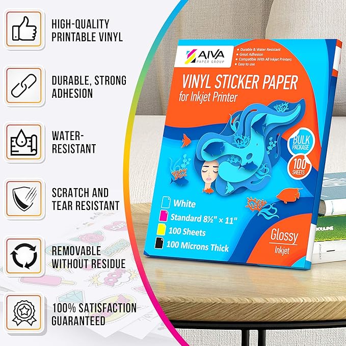 - High-Quality Printable Vinyl Paper - set includes 100 white vinyl sheets of Printable Sticker Paper for printer, Glossy finish. US Standard Letter Size - 8.5"x11". Suitable for High resolution and clear image quality