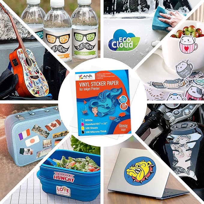 Printable Vinyl Sticker Paper - Waterproof Decal Paper for Inkjet Printer - 100 Self-Adhesive Sheets - Glossy White - Standard Letter Size 8.5"x11"