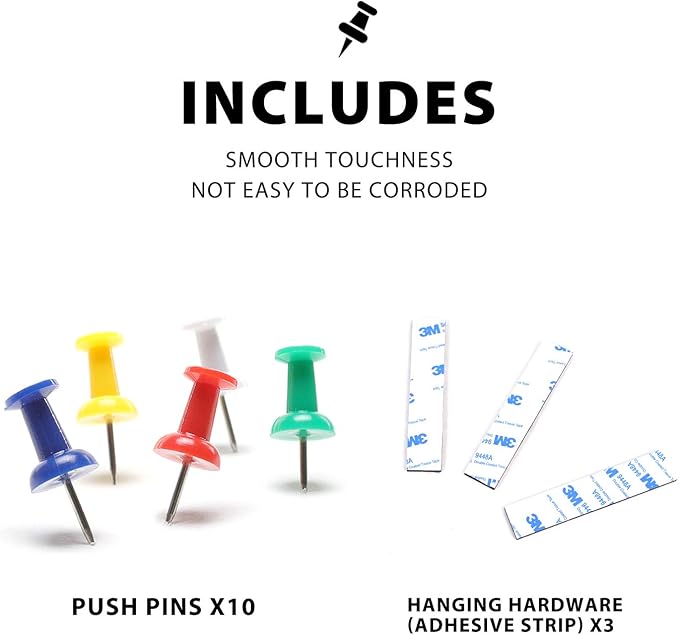 - ACCESSORIES INCLUDED – Comes with mounting hardware and push pins for quick posting For best results use Corksidol Accessories, sold separately Board measures 15" x 1"