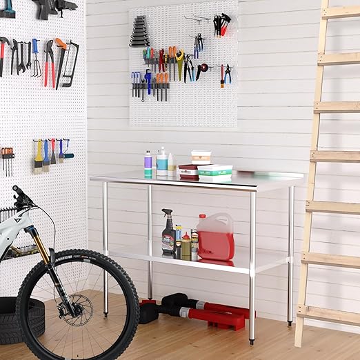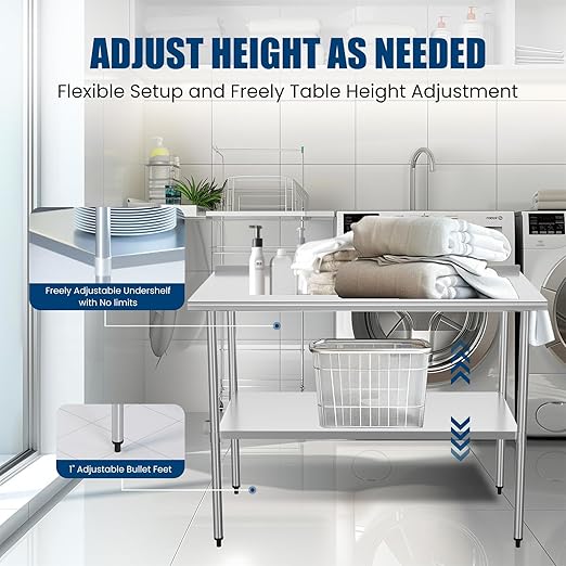- Heavy-Duty Worktable: Measuring 48x24x34 inches, the stainless steel kitchen table provides a spacious workspace. Can support up to 480 lbs on the tabletop and 380 lbs per undershelf, accommodating various storage needs
