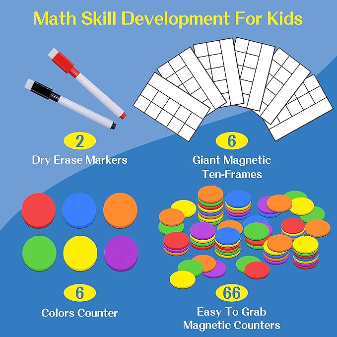 Magnetic Ten-Frame Set,6 Frames(with Blank Writing Space) and 66 Colorful Discs with 2 Markers (Upgraded Version for Fridge & Hand-held)