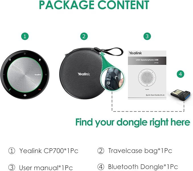 - CONTACT US WHEN ANY QUESTION: 30 days money back, 60 days free return, life time warranty. This Package including 1 Pc CP700 speakerphone, 1 Pc collecting zipper bag,1 Pc user manual, 1 USB Dongle【Dongle at the zip case button.】