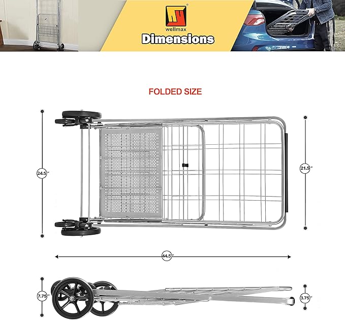 - HEAVY DUTY - This foldable shopping cart is the perfect size for carrying heavy loads. The Wellmax WM99028S shopping cart can fit oodles of items, up to 150 lbs. Better yet, this cart is engineered to fold flat so it won’t take up valuable room your house or apartment. Functional and efficient design are two of our main priorities at Wellmax!